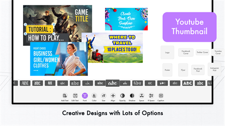 => Choose any layout to design custom Cover pic for Facebook, Twitter, Instagram, Thumbnails and wallpaper for desktop. Every layout has its own aspect ratio. => Select any design from huge list of icons provided as a in-built feature and also adjust its color by picking from the color picker. => Pick any of your picture from gallery and add your own custom pictures in the logo to make it more attractive. => Adjust background color of logo and make it as a theme of your app. => Professional tools for recoloring & editing. => Professional layer management functions that let's you work on logos at ease. => Add custom texts over the logo with different style and color and scale, zoom in/out to adjust over the graphic. => Save your design as a draft or image file in JPG/PNG(for transparent background) formats and also share with your friends to let them see how creative you are!