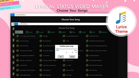 FEATURES: ■ Add Hindi Song For Hindi Lyrical Status ■ Add Bhojpuri Song For Bhojpuri Lyrical Status ■ Add Marathi Song For Marathi Lyrical Status ■ Add Punjabi Song For Punjabi Lyrical Status ■ Add Tamil Song For Tamil Lyrical Status ■ Add Rajasthani Song For Rajasthani Lyrical Status ■ Add Telugu Song For Telugu Lyrical Status ■ Add Haryanvi Song For Haryanvi Lyrical Status ■ Add English Song For English Song Lyrical Status ■ Add Birthday Song For English Song Lyrical Status ■ 1 tap sharing on Social Media ■ Easy to use and user friendly UI ■ Its fully free and convenient to use ■ High quality video created