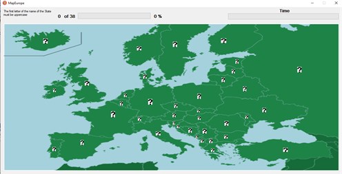 This application is educational in nature. It does not require any information from the user. Helps younger people learn the names and places of the Country on the map of Europe. Easy to use and can be used by the youngest. Each question mark on the map of Europe is one country and you must enter the correct answer in the TextBox. Time to give correct answers to all States is 30 minutes. Good luck! Learn and enjoy!!!