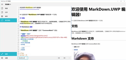 MarkDown.UWP 编辑器支持打开、编辑、保存 本地与OneDrive文档,并且支持Markdown语法高亮、HTML实时预览的UWP编辑器App。