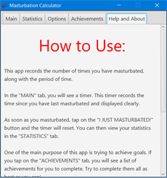 Masturbation Calculator is an app that lets you have fun while masturbating. You can keep track of the amount of times you masturbated and earn achievements for it.