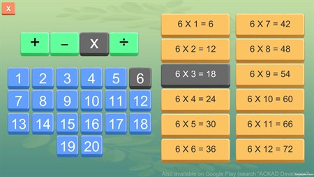 This application is completely free and best way to learn tables of 1 to 20 and improve your marks in school test. Learn multiplication tables with fun. Practice with it daily and train your brain for fast math calculation. Kids and adult both can improve their math basics.