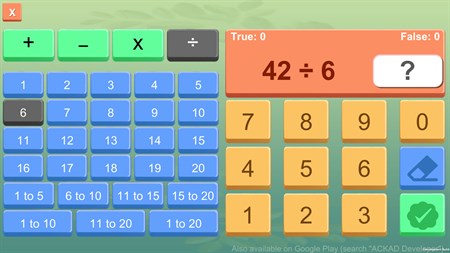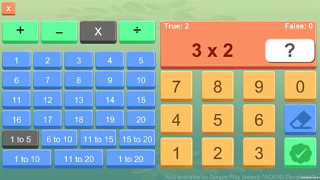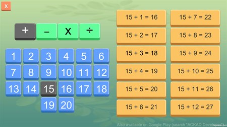 1 to 20 math tables are included with learn and 2 types of quiz modes. You can play quiz using MCQ (Multi choice math questions) or by entering the answer using keypad.
