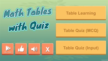 Learn math tables with quiz is completely self-learning application. Learn different types of tables like addition, subtraction, multiplication, and division. It also pronounces the table like 2 times 2 is 4, 2 plus 2 is 4, 2 minus 2 is 0 or 12 divided by 2 is 6.