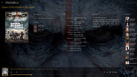 MediaBox is a Media Center application that will allow you to explore through a simple and intuitive interface your Movies, TV Shows, Music, Online radios, YouTube videos. MediaBox will search and analyze your media files. It automatically identifies your files and downloads information such as movie posters, casting, synopsis, album cover …