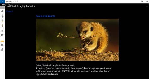Exploring unique animal called Meerkat, observing wildlife, their prey and habitats. Display animal name as well as additional facts about it. Fun facts and knowledge about exotic animals. Make my audience to eager and support for their conservation and links for trusted donation programs for their conservation program.