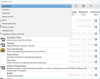 Shows the menu for the canteens of the Studentenwerk of the ulm university. The app displays the menu for the Canteen, the Bistro, the Cafeteria B, the West Side Diner, the Burger bar and the Canteen Prittwitzstraße.