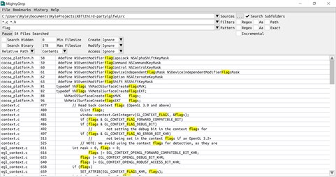 -Search for filenames and text within files -Jump to match in external editor -Incremental search, restart on new text entered -Navigate history with side mouse buttons -Built-in file viewer -Export search results to clipboard, file, or pipe -Drag match to external editor