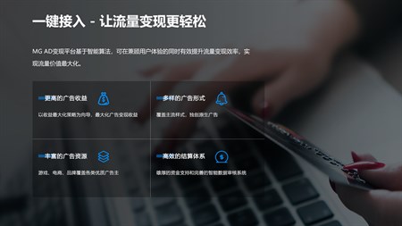 专注打造自己的流量变现方案:凭借丰富的广告形式、海量优质的广告资源、先进智能的广告聚合、新颖独特的互动创意和丰厚稳定的广告收益,MG广告平台为开发者提供了一站式变现解决方案。