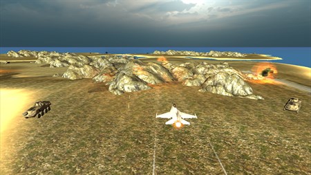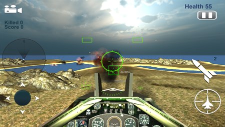 How to Play: For Touch Device:: - Ammunition includes: Bullets, Missiles, and Guided Missiles for all your air strike. - Use radar to detect the nearby enemies in this aircraft simulator. - Select camera view from top right camera button for closer look of the airfighters. - Camera View includes: Cockpit view & External View For Keyboard or PC: - Use arrows keys to rotate left or right, and to move up and down the Jet Fighter - R key is used to change the weapons - C key is to change the camera view - Use Left Control key to fire on enemies vehicles, base camp and fighters
