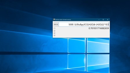 [Usage] Please input formula into input field labeled with "Enter formula here". [Enter] key will run calculation. If you input chemical formula, the program answers molecular weight, molecular formula, and elemental analysis. You can input formula with chemical formula. (eg. H2O-O=2.02) You can input +-*/^(). and numbers and alphabets. E is special character. eg. 2E3 stands for 2x10^3 [Delete] key will clear all inputed formula. Results will be stored into clip board by [ctrl]+[c] Edit List shows lists of atomic weight and abbreviation. But you can not save edited lists.