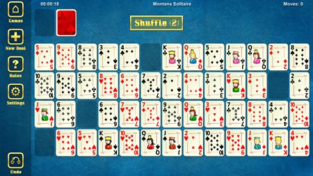 In Montana family of card games, cards are arranged from Deuce to King in 4 rows using one standard 52-card deck. Player is dealt all 52 cards at the beginning in 4 rows of 13 cards. Aces are then removed to create gaps. Player is required to move the cards in the gaps so that it is one rank higher from the card to its left. The aim is to move all cards around to create 4 in-suit sequences from Deuce to King in each row. This game contains 3 variations of Montana Solitaire as following 1. Montana Solitaire 2. Gaps Solitaire 3. Addiction Solitaire