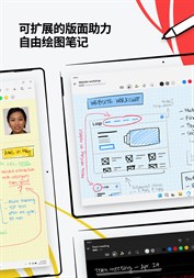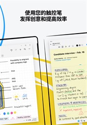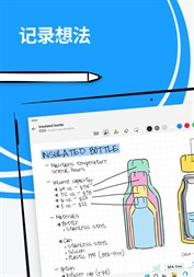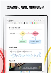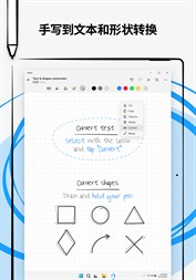 在可扩展的版面上激发想法并记下混合手写内容、文本、绘图、图表和图像的自由绘图笔记。使用笔势擦除和编辑内容,并将手写内容和形状转换为输入文本和完美形式。