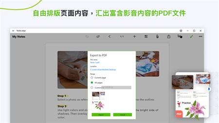 NoteLedge提供自由的创作空间,可随心编排笔记内容,拼贴灵感,串连想法。使用智慧排版工具轻松编排页面,完成的多媒体笔记可导出为富含影音PDF格式分享。无论是创意专案、课堂笔记、个人记事、创意发想或灵感收集,NoteLedge让你一手掌握重点笔记,随身带着走!