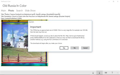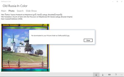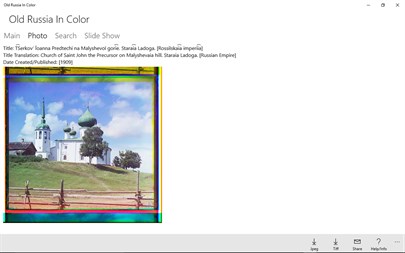 This app allows you to view and search a collection of color photos of pre-revolutionary Russia in the Sergei Mikhailovich Prokudin-Gorskii Collection of color photographic surveys of the vast Russian Empire made between ca. 1905 and 1915 at the Library of Congress and in the public domain.