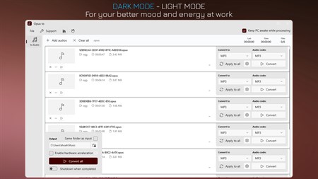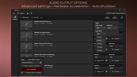 • Enable hardware acceleration to save time. • Auto shutdown when completed. • Save time with multiple files processed at once or focusing on a single audio.
