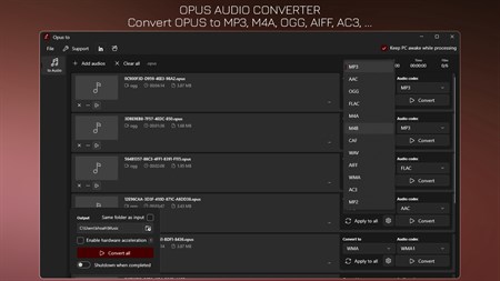 Convert Opus audio to MP3, Opus to WAV. Convert Opus to AAC, OGG, FLAC, M4A, M4B, CAF, WAV, AIFF, WMA, AC3, MP2 . ???? Convert multiple files at once, there's no limit to how many files. ???? All processing is performed locally on your computer where your files remain safe and private.