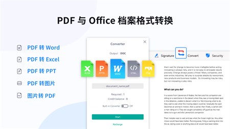 PDF转档 • 支援云端与内建转档工具 • 支援PDF转Word、Excel、PPT、纯文字、电子书和图片档 (如docx, xlsx, pptx, png, txt, rtf, ePub, AZW3, MOBI等) • 支援将图片转为PDF档