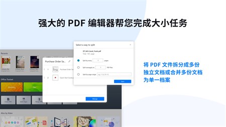 管理档案 • 压缩档案 • 合并与分割PDF • 支援汇出功能,可以含注释PDF或合并副本方式分享档案 • 直接从PDF Reader内发送传真