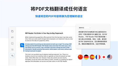 • 即时翻译段落:支援100种以上语言翻译,让您轻松理解与储存PDF翻译内容。