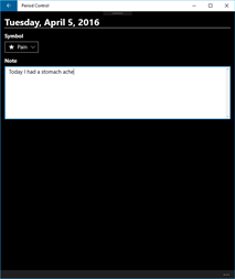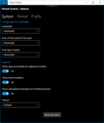 Notes and symbols: You can write notes on any day, and set symbols indicating pain, illness, extra bleeding etc. That way you can keep a diary for your period, or practically anything regarding your period/p-pills. Live Tiles: Period Control supports live tiles to keep you informed. You can see when your current period is supposed to stop, and when the next is supposed to start and if you have taken your p-pill. (If enabled)