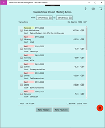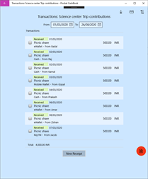 The app provides a Transactions view to record receipts and / or payments. And it also provides a Summary view to report on recorded receipts and payments. You can record transactions for any date and the app updates the balances and totals accordingly. On each transaction you must enter a date, amount and an account head. Additionally you may enter a narration, quantity, payment method and classification.