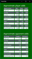 Calculations process takes around fifteen seconds, generally based on a limited number of simulations for roughly +/- 6% results accuracy. In some rare cases the calculations are done considering all dealing possibilities. More details on the results are visible on the Details page, like opponent odds or odds for a specific hand's rank.