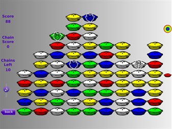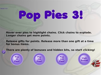 Pop Pies! is a simple yet addictive game. Explode chains of adjacent like-colored pies for points. The bigger the chain, the more points you get. The rest of the pies then settle in to fill in the gaps, hopefully creating more chains for you to pop. Some pies have gift boxes on them; pop as many of those in the same chain as possible for more points or special items. Start with a board of 99, 208, or a whopping 340 pies! How many points can you get before there are no more chains left?