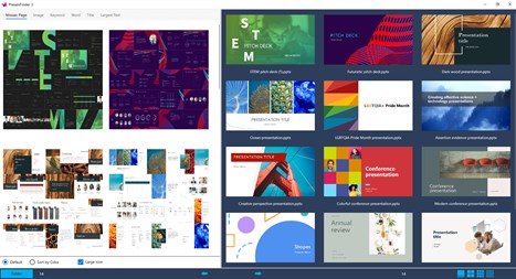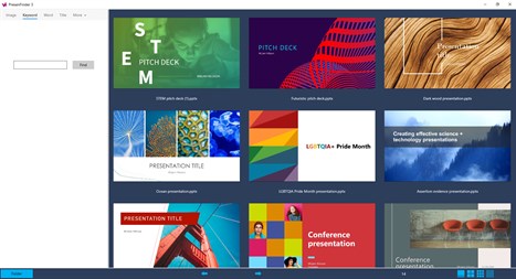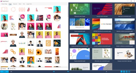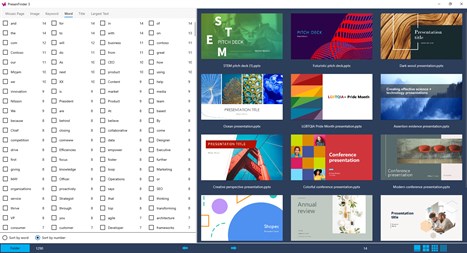 View PowerPoint files (pptx) and quickly search in unique ways using words and images. Search processing using images arranged in a mosaic of all pages of PowerPoint You can sort the image list by characteristic color. Developed on Universal Windows Platform (UWP), there is no limit to the number of files that can be previewed.