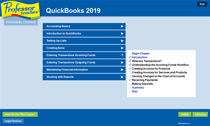 Professor Teaches QuickBooks 2019 is computer training software designed to teach you the ins and outs of Intuit QuickBooks Pro. This hands-on, interactive course will provide everything you need to know about the fundamentals of QuickBooks.