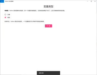 本应用是一套完全面向零基础初学者的 Python 2 教程。相比于枯燥的书本和被动的视频教程,本应用能提供交互式的学习体验——在详尽的讲解中,你可以一键运行所有的示例代码,即时查看代码运行效果;课后包含检验所学知识的判断题和选择题,你可以直接作答并查看答案和解析;最后还有拓展所学知识的代码实战题,让你在真实的代码编辑器中将理论转化为实践。以下是全部章节目录: