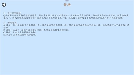1、 关于Q星探秘 Q星探秘是新颖有趣的推理类游戏,新一季最强大脑节目比赛项目。星图被分为多个星区,部分星区含有一颗星球,颜色为红黄蓝之一。游戏目的是通过移动将不同颜色的三个星球聚合在一起,且从圆心划分的每个扇形区域中有且只有一个聚合星球。