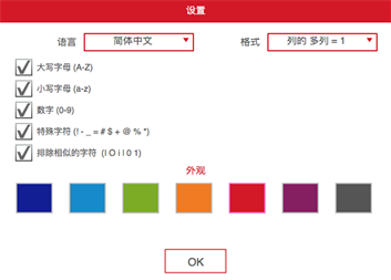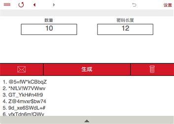 密码生成器: • 生成随机密码。 • 密码生成器可以按照你的设定生成密码。 • 设置密码长度,密码复杂程度 (小写字母,大写字母,数字,特殊字符),密码数量等,点击 生成。 • 排除相似的字符 (I O i l 0 1)