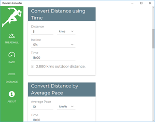 A simple converter program for runners made for fun and has following conversion capabilities: - Threadmill to Outdoor running conversion (gives an estimate outdoor running equivalent of your threadmill performance) - Pace Conversions - Distance Conversions