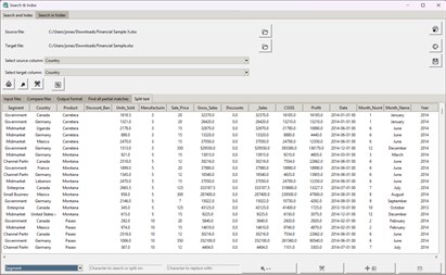 Split Text: Divide a column's text by a specified delimiter and save it to a new file. The modified text can also be appended back to the main Search and Index window, where it can be used for subsequent tasks like comparing or finding values.