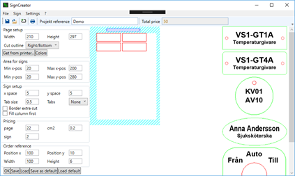 Software for design and manufacturing of signs and nametags etc. Support for double sided signs. Create templates and automatically manufacture signs from text file (exported from excel) and send direct to laser engraver. The software is developed and tested against GCC LaserPro laser machines, but should work with any laser engraver that is detected by windows as a printer. It is also possible to print to pdf and import in other software.