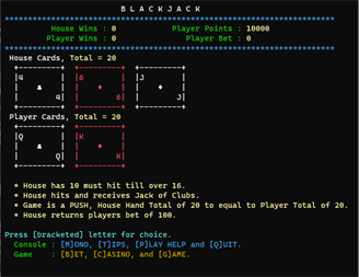 Welcome to the 1980s! This game uses a text color retro-style look and feel to provide a modern version of Blackjack. This might be a text game, but this version of blackjack supports the standard features you want in any blackjack game. You can hit, stand, double and purchase insurance. You play using single key presses following a simple menu system. This text version is the perfect blast from the past that you need for that coffee break when you are having a quick snack between video Microsoft teams calls.