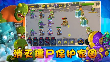 游戏特点: ● 无需大量手动操作,您只需简单地强化和升级您的单位,即可体验全新的刺激塔防战斗。 ●丰富的武器系统,各具特色的武器在战斗中可以轮流使用,具有不同的功能。 ●各种类型的僵尸,给你不同的游戏体验。 ●独创超级科技系统,使你战斗力加倍。