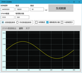 1. 本应用主要用于生成正弦函数表。用于生成逆变器H桥使用的正弦函数表。 2. 需要确定单片机始终频率、载波频率和基波频率。自动计算SPWM幅值,和每周期内的点数。 3. SPWM 采样方式分对称规则采样和不对称规则采样。 4. 半周期模式 -> 选中只生成半个周期的数据。否则生成一个周期数据。 5. 删除直流分量 -> 会将SPWM幅值/2 生成带有负数的数据。 6. 十六进制显示 -> 生成的数据按HEX 格式显示。
