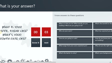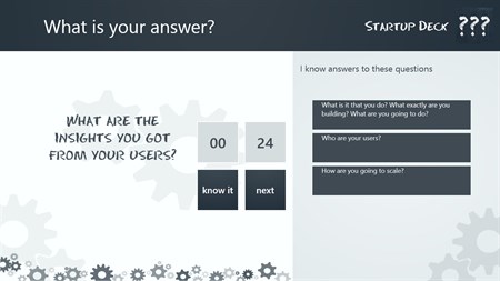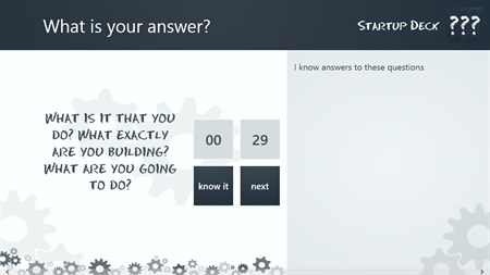 Are you preparing for a y combinator or seedcamp startup pitch?? Are you a startup founder or working in a startup?? Can you answer this questions?? => Who needs what you're making? => What, exactly, makes you different from existing options? => How will customers and/or users find out about you? => How are you going to scale? => What has surprised you about user behavior? Whether you can or you can't answer this questions, download startup deck Windows 8 app to get over 130+ question to practice for your perfect pitch wherever you go on move. Prepare your startup pitch like a pro! with startup deck android app The best way to prepare for your big startup pitch is asking yourself the right questions. Startup Deck Features * The best startup questions collected in your pocket. * Questions from Y Combinator, Seedcamp, TechStars. * Helps you nail your pitches like a pro. * Practice anytime, anywhere, with timer. Download Startup deck and improve your startup pitching. Build with help from Francis Dierick.