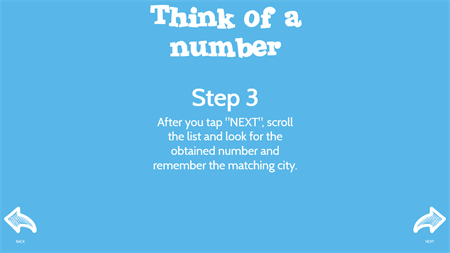 The app that can read your mind! Pick a number, follow the instructions in the application and find the city that corresponds to your number, the application will guess the corresponding city! Try it now!
