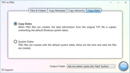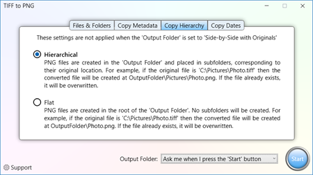 Your conversion, your way. • Create PNG files in a new folder, optionally preserving the original TIFF folder hierarchy. • PNG Metadata 'Date Taken' is copied (optional) • Create PNG files side-by-side with the TIFF files, with the same filename. • Copy the creation and modification dates, or use the system dates.