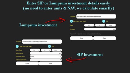 Investment Entry: Adding SIP and lump sum investment details is a breeze. For lump sum investments, just enter the amount and date, and the app will fetch NAV and units automatically. Similarly, for SIP investments, provide start date, amount, frequency (Weekly, Fortnightly, Monthly, Quarterly), and instalments, and let the app handle the rest.