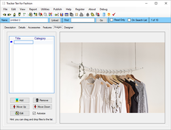 Tracker Ten for Fashion is a full-featured database system that tracks your clothing, shoes and accessories. You can use the software to easily organize and track your collection. The software features advanced reporting, graph generation, rich text format notes, data export, a powerful search engine, full customization, cost and value tracking, barcode scanning and generation and more. The software can also generate full color reports, incorporating images, great for accurate insurance record keeping and automatic catalog generation. The software is ideal for both business and personal use.
