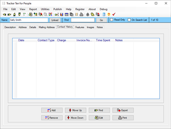 Easily keep track of people with Tracker Ten for People. The software can be used to tracks club members, students, community members, volunteers, customers, employees, mailing lists, and more! The software can store category, contact information, postal address, email address, contact history, notes, associated document scans, images and much more. The software features a powerful search engine, a report writer, HTML generation, mailing label printing (on standard label printers), a spreadsheet view, a graph generator, rich text format data areas, an album view, and multiple image support. As an added bonus, the software can be easily customized to suit your individual needs, and you can also export data to other software applications.