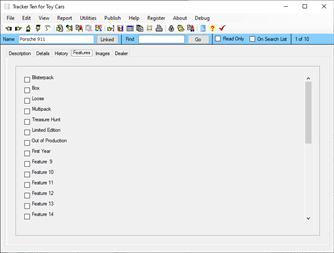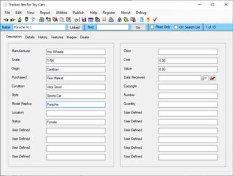 Tracker Ten for Toy Cars is a complete windows inventory system that will help you get you organized fast. The software features advanced reporting, graph generation, item history tracking, customizable data fields, rich text format notes, data export, a powerful search engine, cost and value tracking (based on values you enter yourself) and an innovative summary view integrated with internet searching. The software can also generate full color reports, incorporating images; great for accurate insurance record keeping and automatic catalog generation. The software is ideal for both business and personal use.
