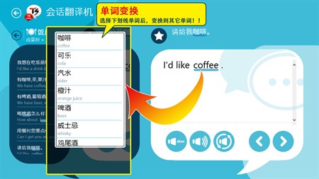 主要的特征:支持双方的10各语言会话翻译和地道的发音。
