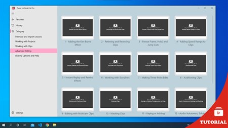 This app includes 50 easy-to-follow video lessons on Apple's professional video editing app Final Cut Pro. This app starts out by looking at the interface, importing and analyzing clips, and organizing clips and events. Then creating projects including changing project settings, adding clips, and adding audio. Then take a closer look at working with clips including adding effects to a clip, adding titles, detaching audio from a clip, and making clip adjustments. Then go to more advanced editing options including adding the Ken Burns effect, retiming clips, adding speed ramps, adding a blue or green screen effect, and matching color between clips. Then wrap it up by looking at various ways to share your finished project and find help including finding a list of keyboard shortcuts. Lessons includes: (I) Final Cut Pro Interface and Import Lessons 1. Interface Overview 2. Importing and Analyzing 3. Importing from the Photos App 4. Creating and Organizing Libraries 5. Creating and Organizing Events 6. Selecting Clips and Ranges in Clips 7. Rating Clips 8. Adding Keywords to Clips 9. Creating Smart Collections 10. Using the Playhead and Skimmer 11. Viewer Options 12. Adjusting a Clip’s Date and Time 13. Working with Clip Roles