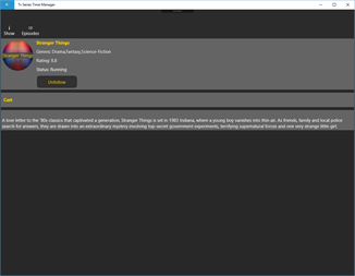 Tv Series Time is the best app to follow your preferred Tv Series. With Tv Series Time you can search your and add to your list your preferred TV Series like Stranger Things, The walking Dead, Breaking Bad and thousands more... You can see ratings and for every TV Series the list of all the episodes and their summary. You can see the cast of each Tv Series and from The Cast page you can reach and follow other Tv Series made by the actor your are interested in. After you have watched an episode, mark it as read and Tv series will tell you all the episodes that you can already watch online. Tv Series has also a very handy calendar where you can see when your favorite episodes will be aired. With Tv Series Time you will never miss again an episode.