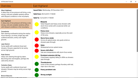UK Mountain Weather forecasts for the main mountain areas and those which have the highest visitor numbers. Forecast information is available for the UK mountain areas of the West and East Highlands, Snowdonia, Lake District, Peak District, Yorkshire Dales and Brecon Beacons. The forecast is presented as a risk of occurrence of a selection of hazards (red=high; amber=medium; green=low / no risk). All data sourced from the Met Office.